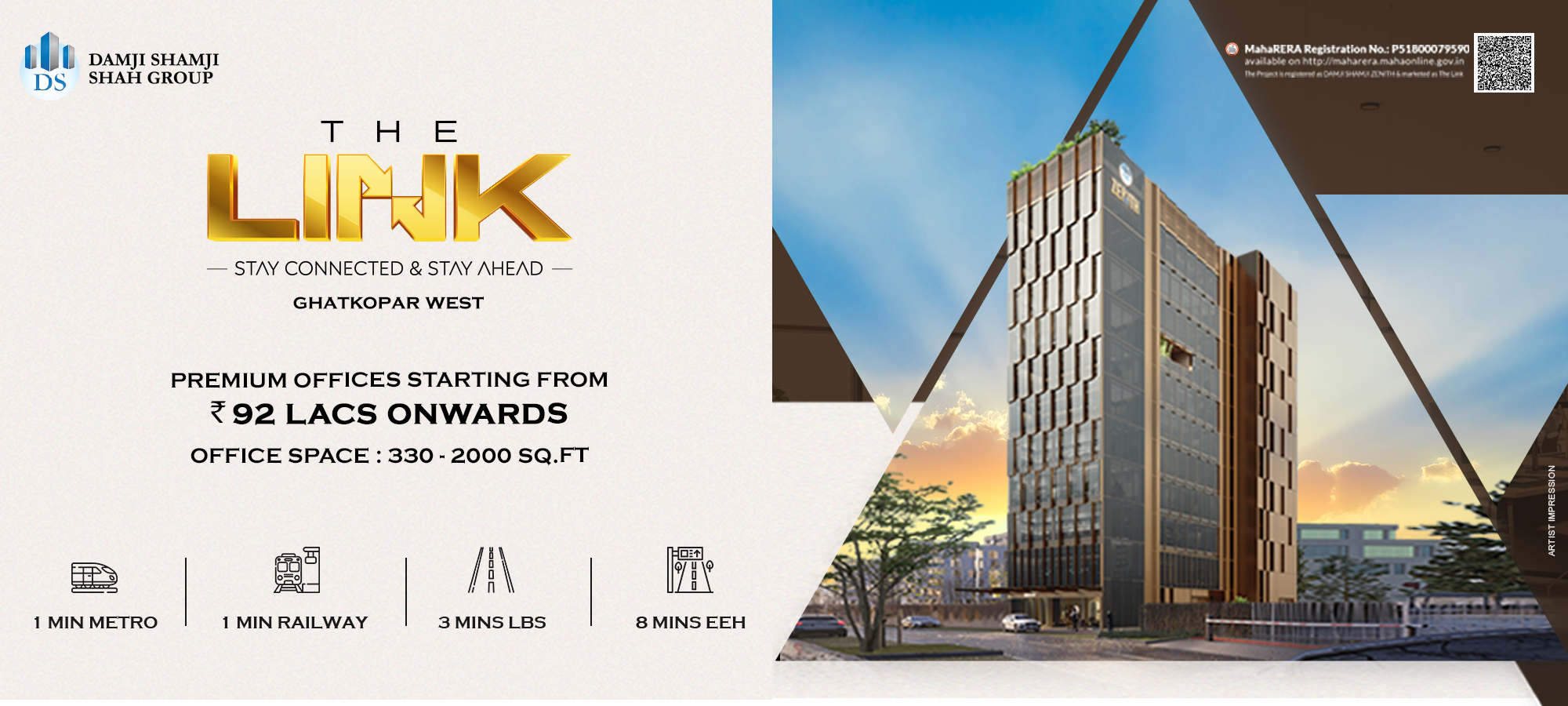 The Link is a premium commercial project strategically positioned in Ghatkopar west, offering unmatched connectivity and accessibility. Warm-Shell Offices from 330 Sq.ft to 2000 Sq.ft. Well Designed to cater to modern businesses, entrepreneurs, and investors, it provides the perfect platform to thrive within Mumbai’s ever-evolving, fast-paced commercial landscape, leveraging its dynamism to drive innovation and success.